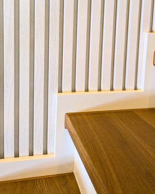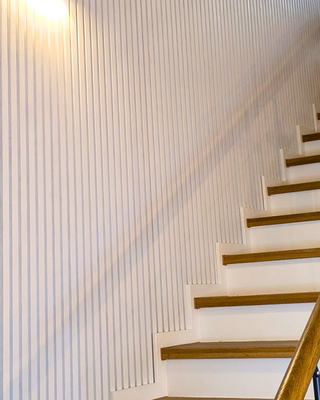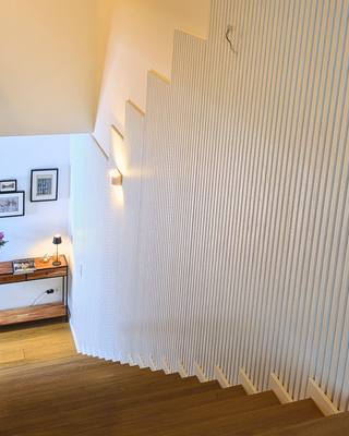 Familie P: "Uns war wichtig, dass die Paneele den Raum nicht schwer wirken lassen. Da wir einen Eichenparkettboden und Eichentrittstufen haben, wäre eine Holzoptik an der Wand zu viel gewesen. Weiß auf Weiß wirkt ruhig und leicht und es passt einfach perfekt."