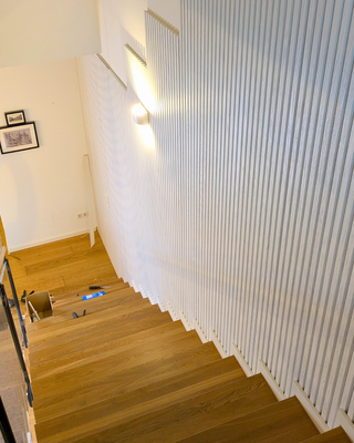 Wenn Akustikpaneele nicht nur an einer geraden Wand montiert werden, sondern sich über die gesamte Treppe ziehen, entsteht ein Projekt, das viel Genauigkeit und Geduld verlangt. Jede Paneele braucht ein eigenes Maß. Jede Stufe hat eigene Winkel. Jede Schnittkante muss auf den Millimeter stimmen.