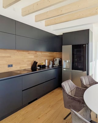 Eigentümer: "Absolut! Es war mir sehr wichtig, dass der Spritzschutz an der Küchenwand farblich und stilistisch zum Holzboden passt. Ich wollte eine harmonische Optik erzeugen, die das natürliche Flair des Holzes aufnimmt und in die gesamte Küchengestaltung integriert. Die Kombination aus dem warmen Holzton und den dunklen Küchenelementen schafft eine tolle Balance."