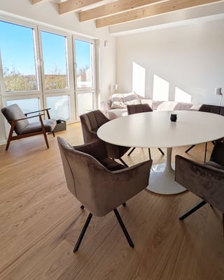 Parkettwelt Adendorf: "Beim Betreten dieser geschmackvoll eingerichteten Wohnung fällt sofort der Einrichtungsstil ins Auge. Klare Linien, hochwertige Materialien und ein durchdachtes Farbkonzept schaffen eine Atmosphäre von moderner Eleganz. Einen wesentlichen Beitrag zu diesem gelungenen Ambiente leistet der Bodenbelag: Die HARO Eiche Variant, fachmännisch verlegt von den Profis der Parkettwelt Adendorf. Was hat Sie zu dieser Wahl bewogen?"